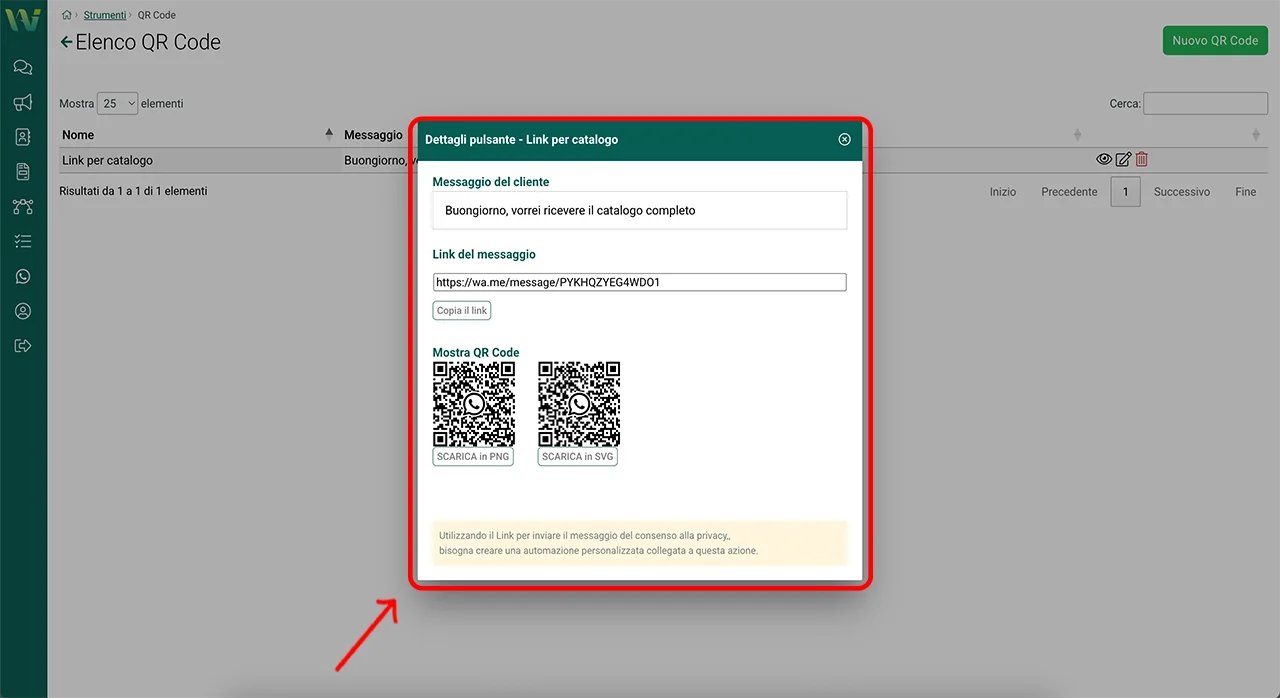 • Visualizzare il messaggio predefinito che verrà inviato su WhatsApp una volta scansionato il QR Code