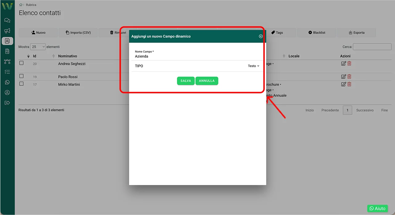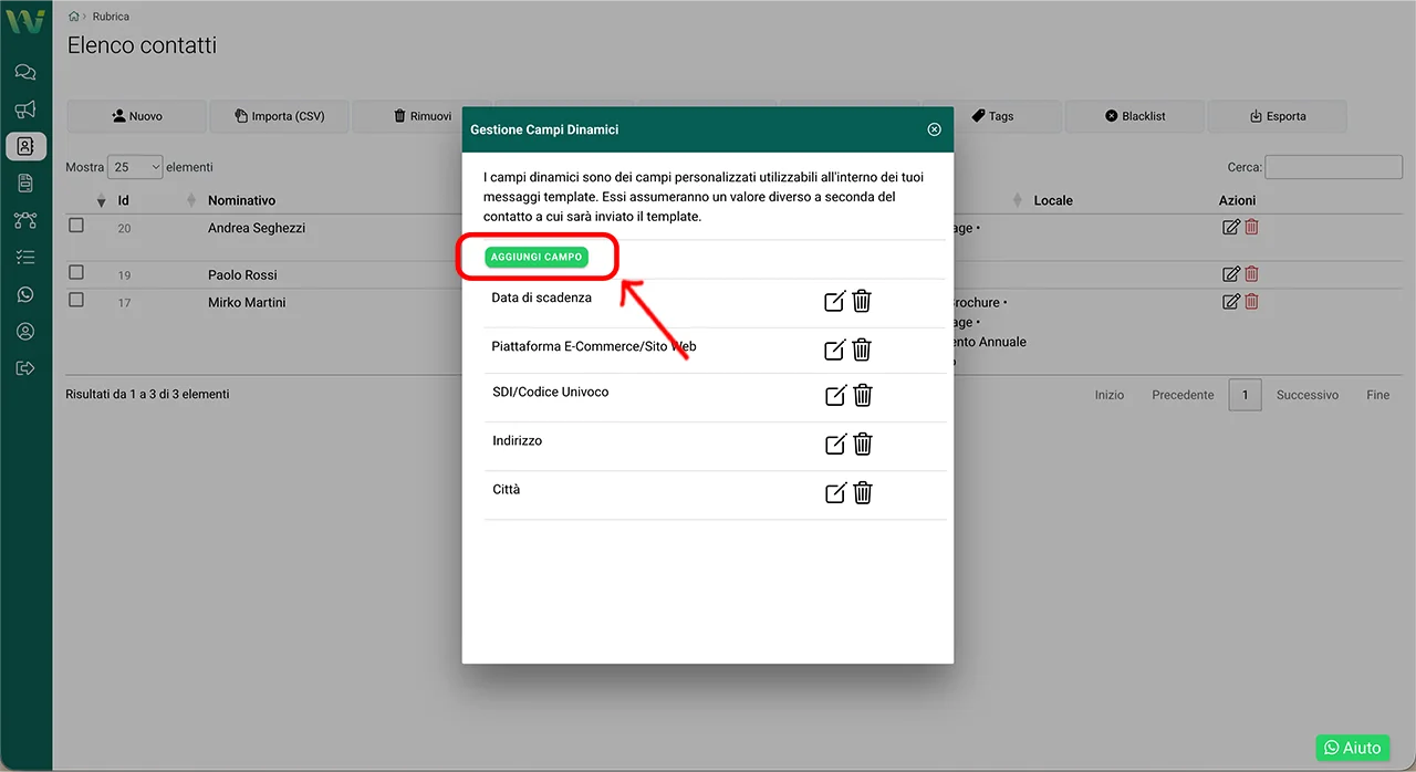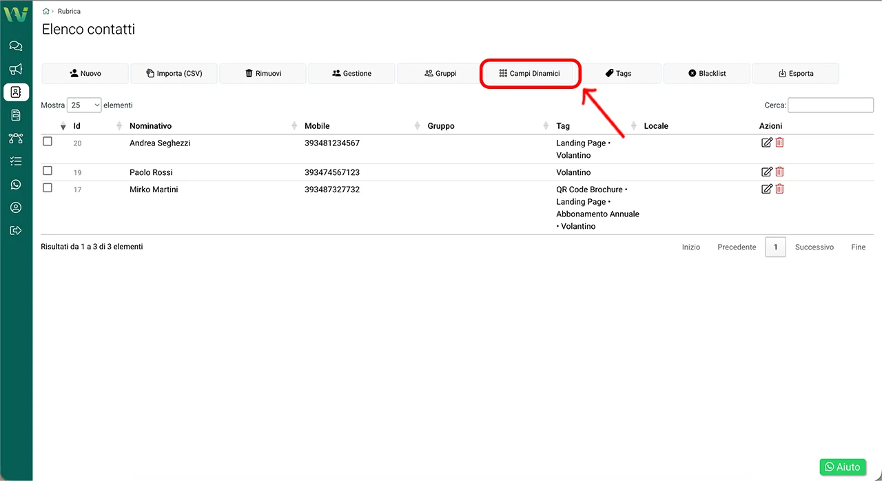 - Andate in Rubrica e cliccate sulla voce Campi dinamici.