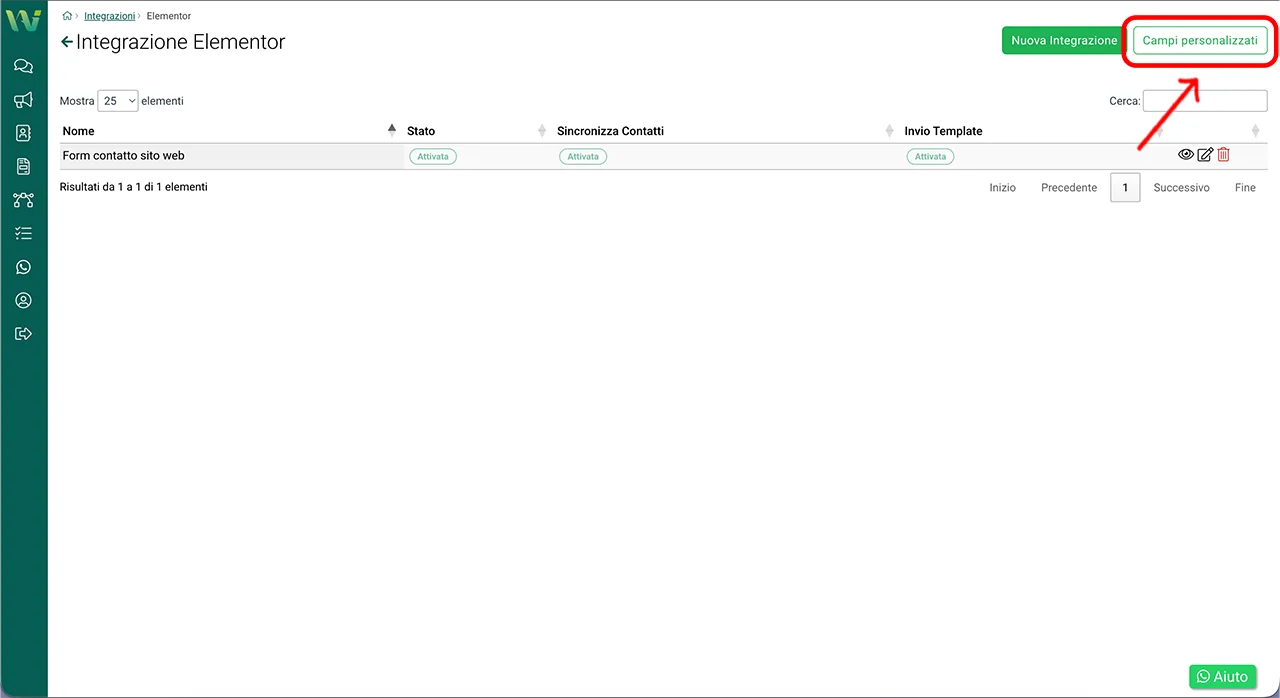 Nella schermata dedicata alle integrazioni Elementor, cliccate sul pulsante Nuova Integrazione per creare una nuova connessione tra il modulo Elementor e la piattaforma WA Smart Business.