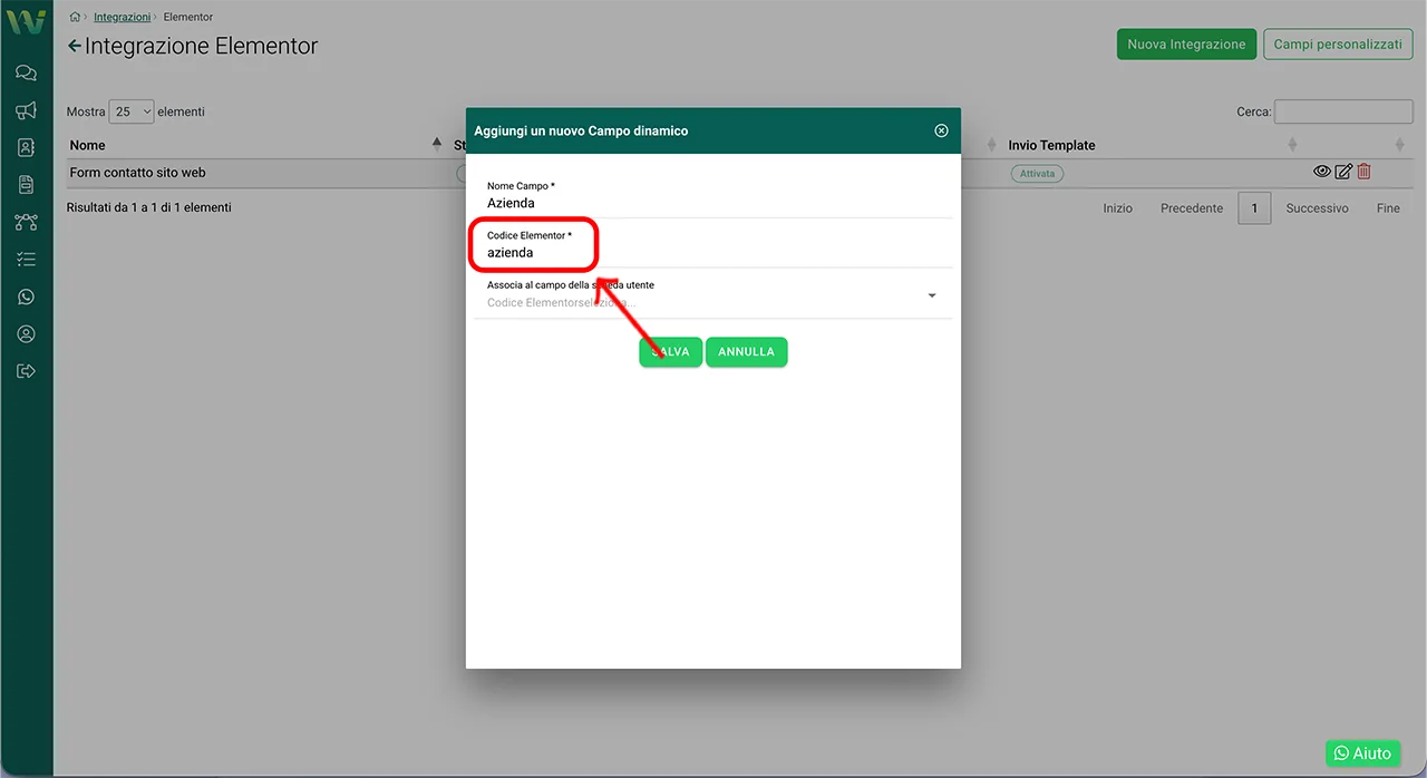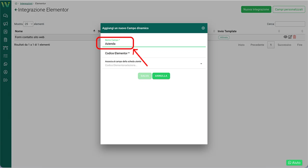 Nota importante: immaginiamo che nel modulo di contatto di Elementor abbiate un campo aggiuntivo rispetto a Nome, Cognome, Email e Numero di telefono (che sono gestiti di default dalla piattaforma), ad esempio il campo Nome azienda, che volete salvare all’interno della scheda contatto del cliente in WA Smart Business.