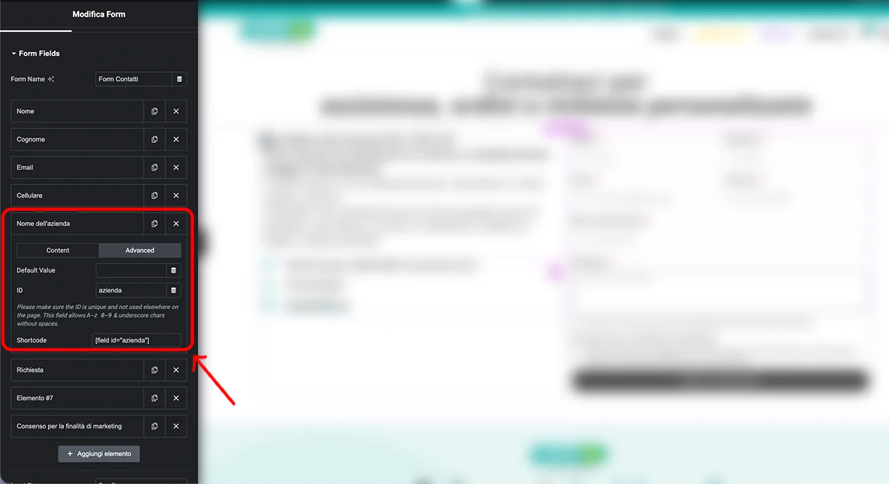 - Nel campo Codice Elementor dovete inserire l’ID del campo del form di Elementor. Andate quindi nel modulo di Elementor, aprite il campo corrispondente (ad esempio il campo Azienda), andate nella scheda Advanced/Avanzato e copiate il valore presente nel campo ID. Nell’esempio, l’ID è azienda (scritto tutto in minuscolo).