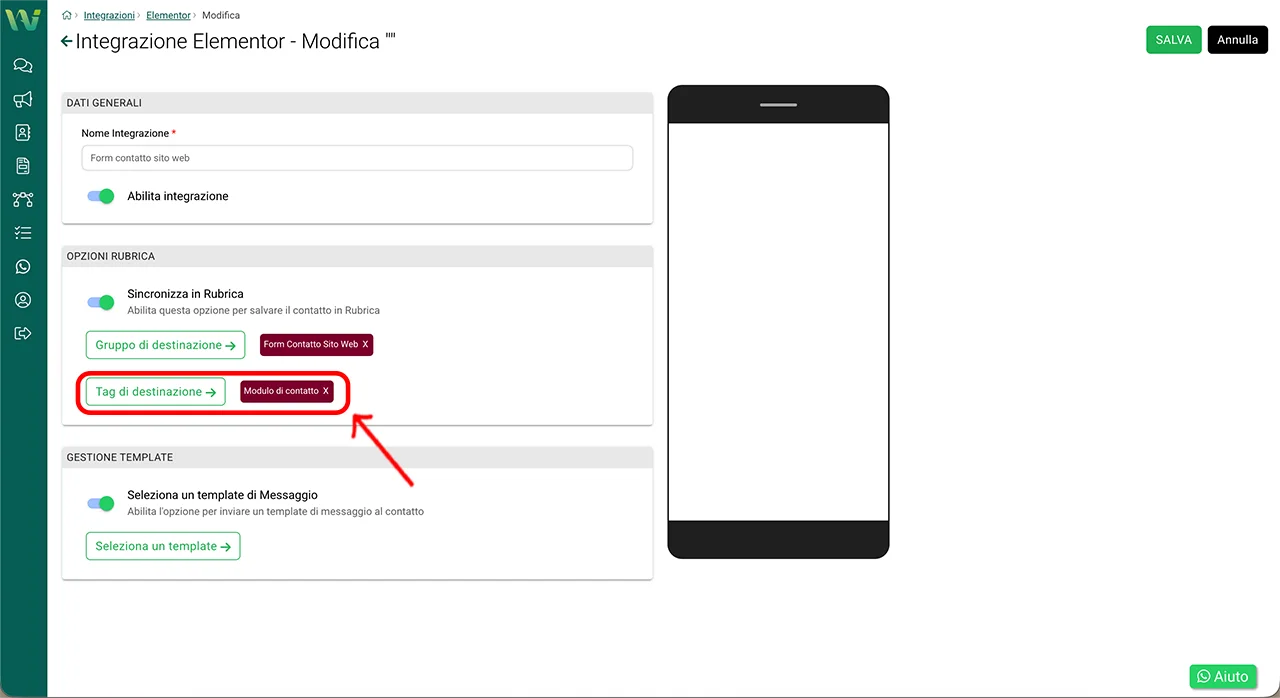 Dopo aver configurato gruppi e tag, potete impostare l’invio automatico di un messaggio WhatsApp ogni volta che un utente compila il modulo di Elementor.