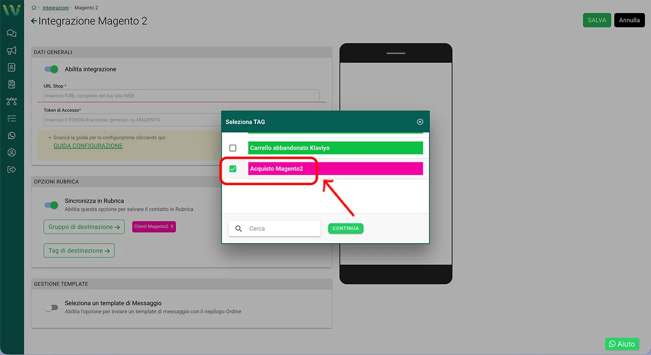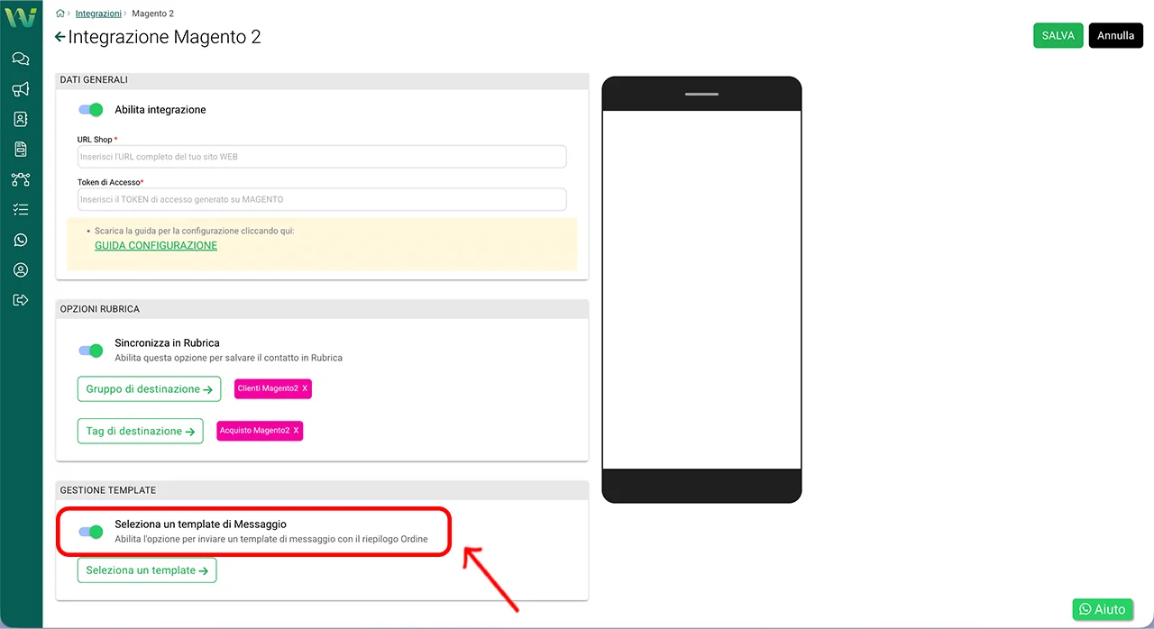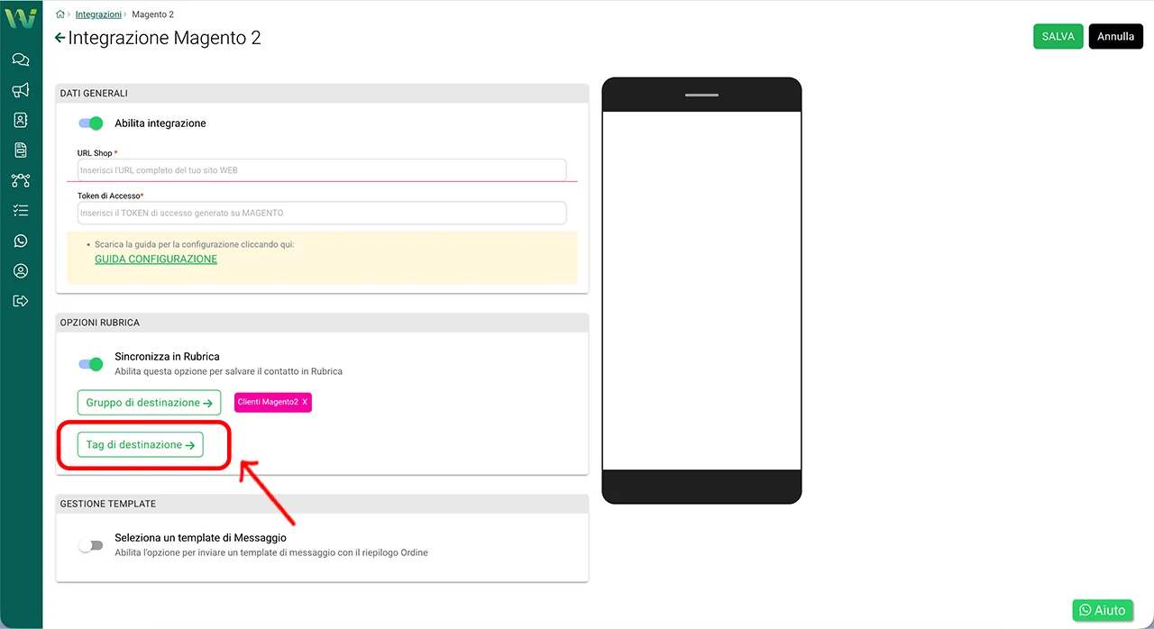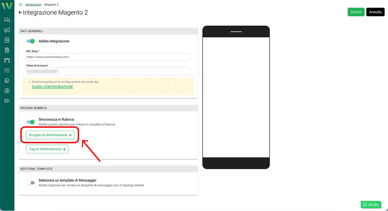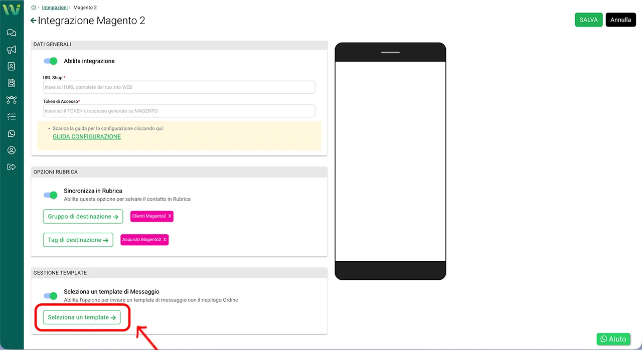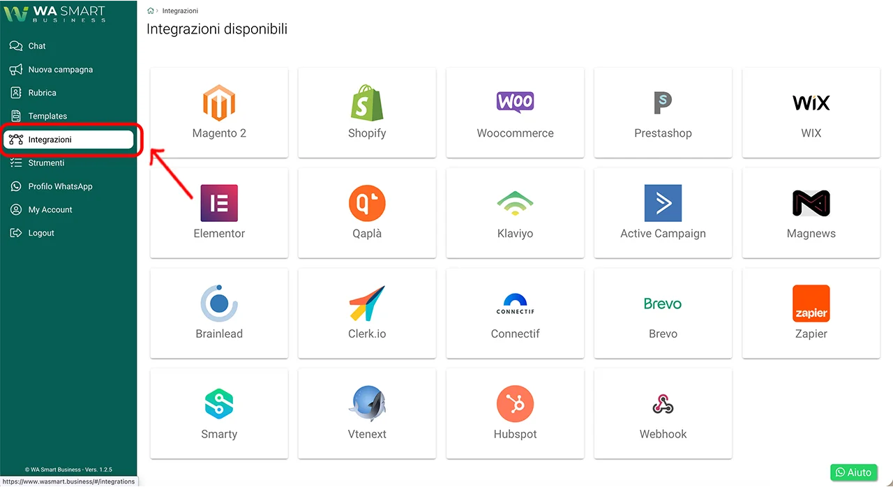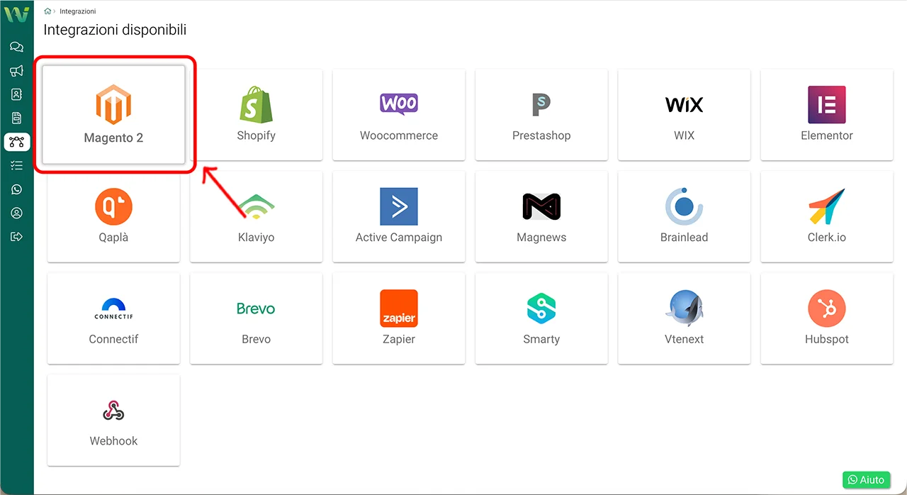 Tornate nella dashboard di WA Smart Business e aprite nuovamente: Integrazioni → Magento 2.