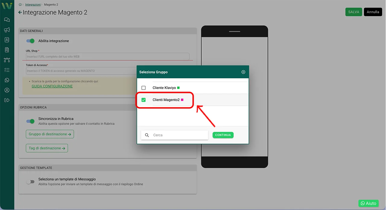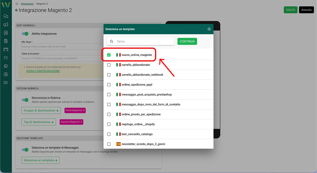 selezionate il template creato per Magento 2 (nell’esempio: nuovo_ordine_magento) e poi cliccate su Continua