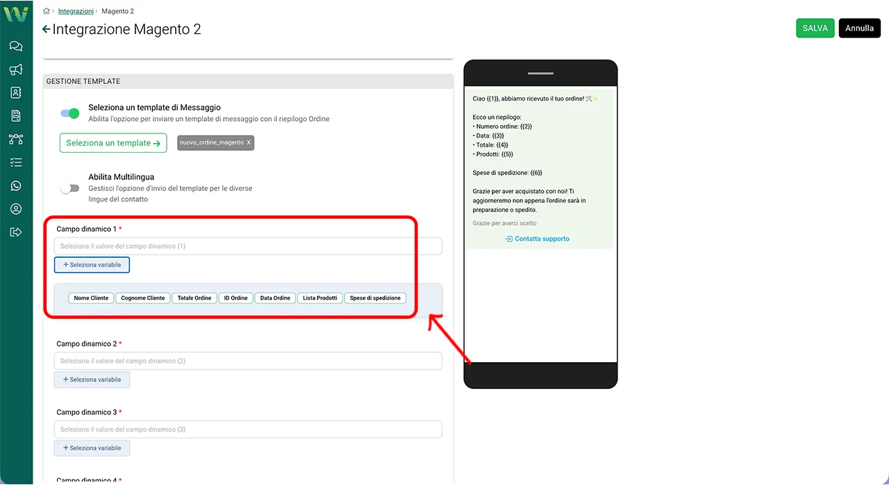 Sotto, nella sezione Campo dinamico 1, Campo dinamico 2, … potete associare ogni variabile ai dati di Magento.