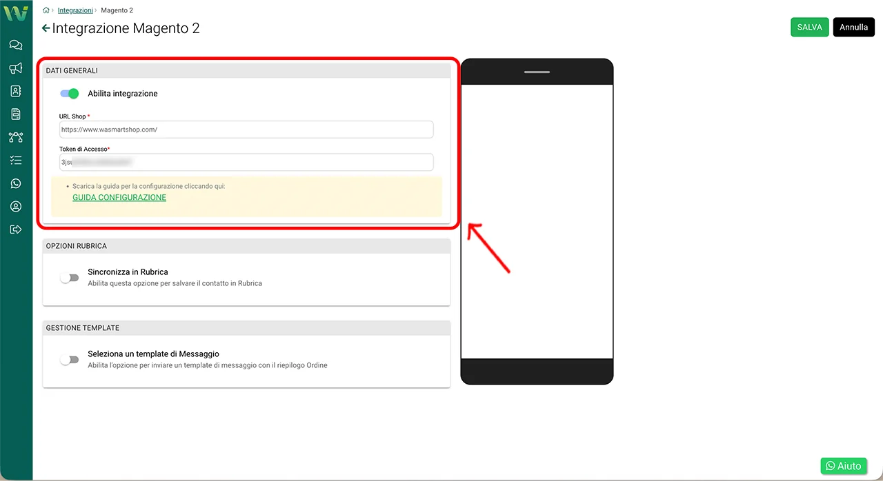 2.2 – Inserire URL Shop e Token di accesso in WA Smart Business
