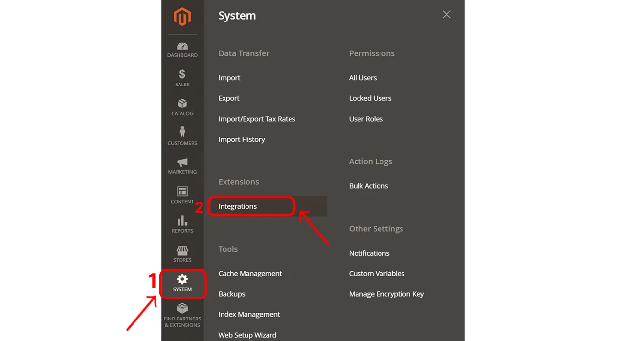 Entrate nella dashboard amministrativa del vostro sito Magento 2 con il vostro utente admin - Aprire la sezione Integrazioni.