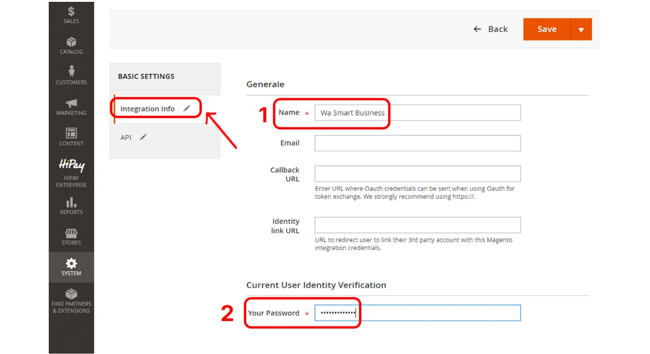 Per completare l’integrazione è necessario generare un Access Token all’interno del pannello di amministrazione di Magento 2 e inserirlo in WA Smart Business, insieme all’URL del vostro shop.
