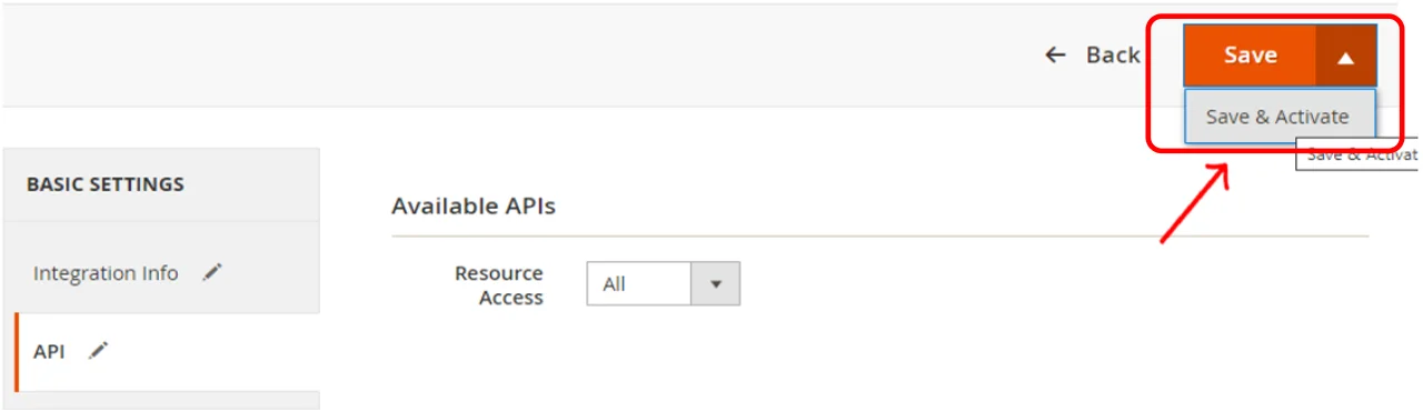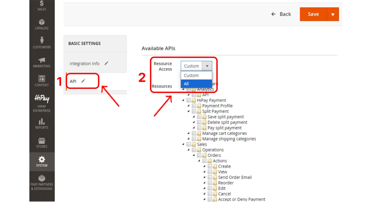 Nel campo Resource Access selezionate All dal menu a tendina. In questo modo l’integrazione avrà accesso a tutte le API necessarie per leggere gli ordini e i dati dei clienti, evitando problemi di permessi in fase di sincronizzazione.