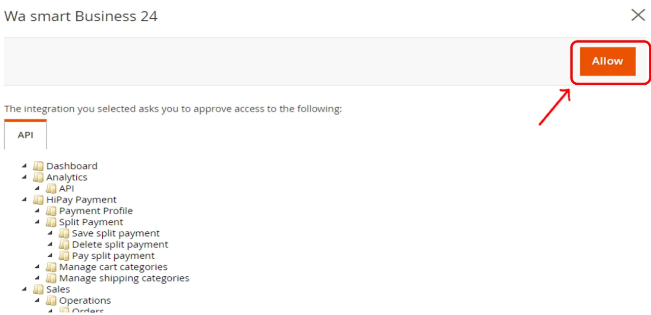 - Magento mostrerà una schermata di conferma dei permessi richiesti