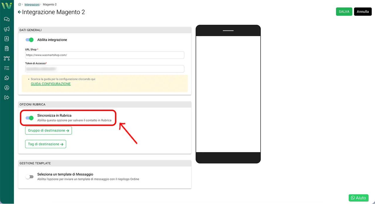 Attivate l’interruttore Abilita integrazione per rendere effettivo il collegamento tra Magento 2 e WA Smart Business.