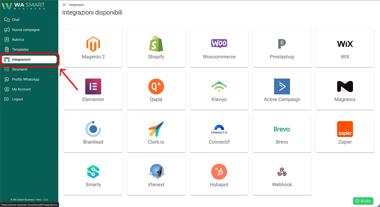 Dal menu laterale della piattaforma WA Smart Business, cliccate su Integrazioni.