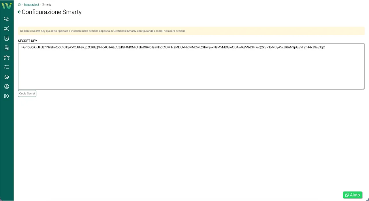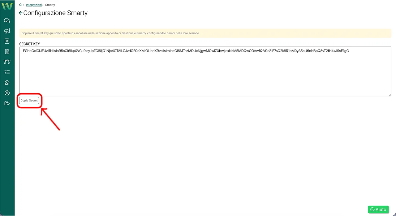 Una volta copiata la Secret Key, il passaggio successivo è configurare Smarty in modo che utilizzi WA Smart Business come provider per l’invio dei messaggi WhatsApp.