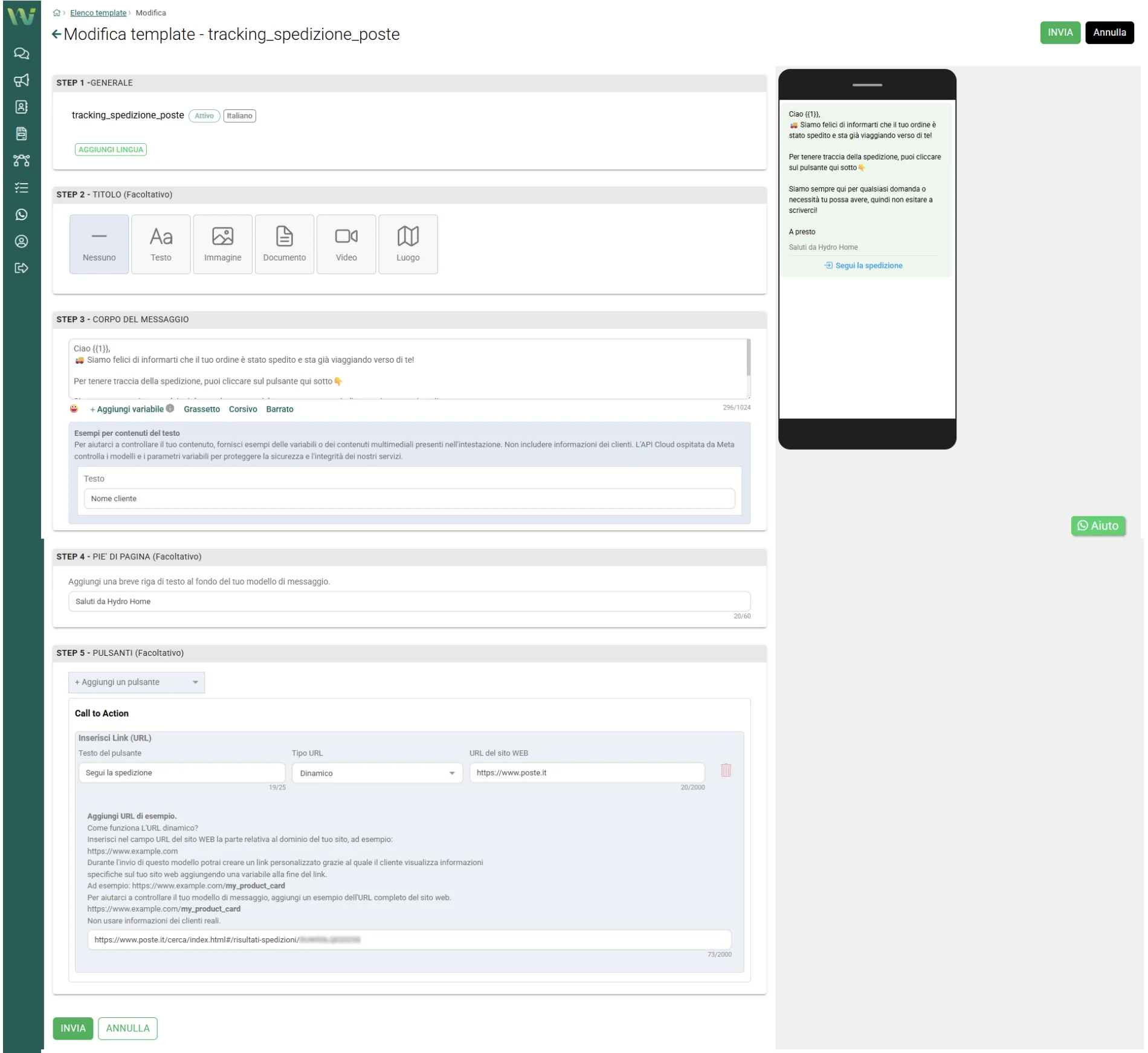 Fase 4 – Creare il template di tracking spedizione in WA Smart Business